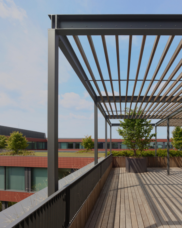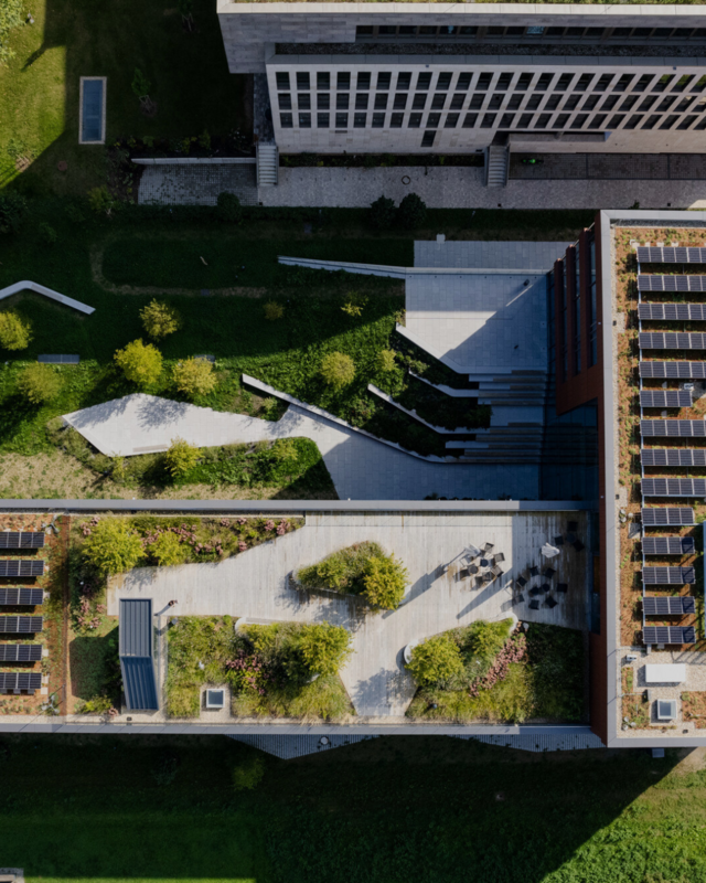 - Grünflächen: Begrünte Dächer und Außenflächen fördern die Biodiversität und das Wohlbefinden unserer Teams.